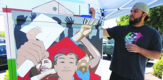 Paint brush in hand, David Gutierrez makes the final touches to his latest artwork, a utility box on Tres Pinos Road in Hollister. “This...