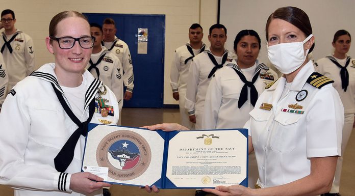 Operations Specialist 1st Class Patricia Flock of Hollister, assigned to Navy Recruiting Station Portland, Division 7, Talent Acquisition Onboarding Center Alamo City, was presented the Navy and Marine Corps Achievement Medal by Cmdr. Stephanie Simoni at Navy Operations Support Center Corpus Christi.
