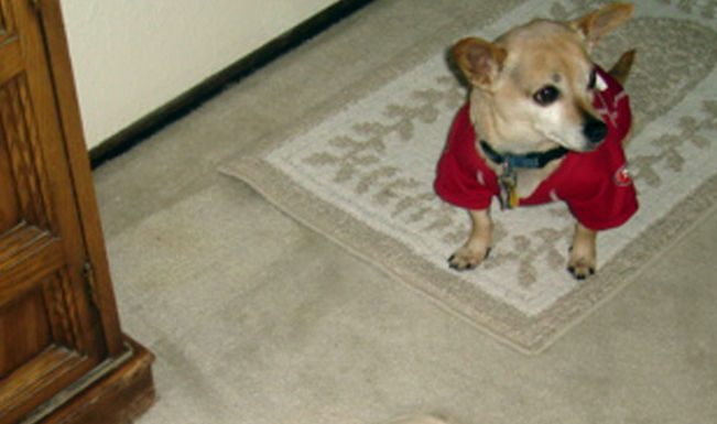 My dog Joey, named after Joe Montana of course, is my constant companion and fellow 49er fan. He always listens to me if I have complaints about how the team is doing and celebrates with me when they are doing well. He has his very own 49er jersey and wears it proudly on game days. Joey was found wandering alone in rural Hollister about a year and a half ago. Even though we don’t know his true heritage, he is most likely a Maltese mix.